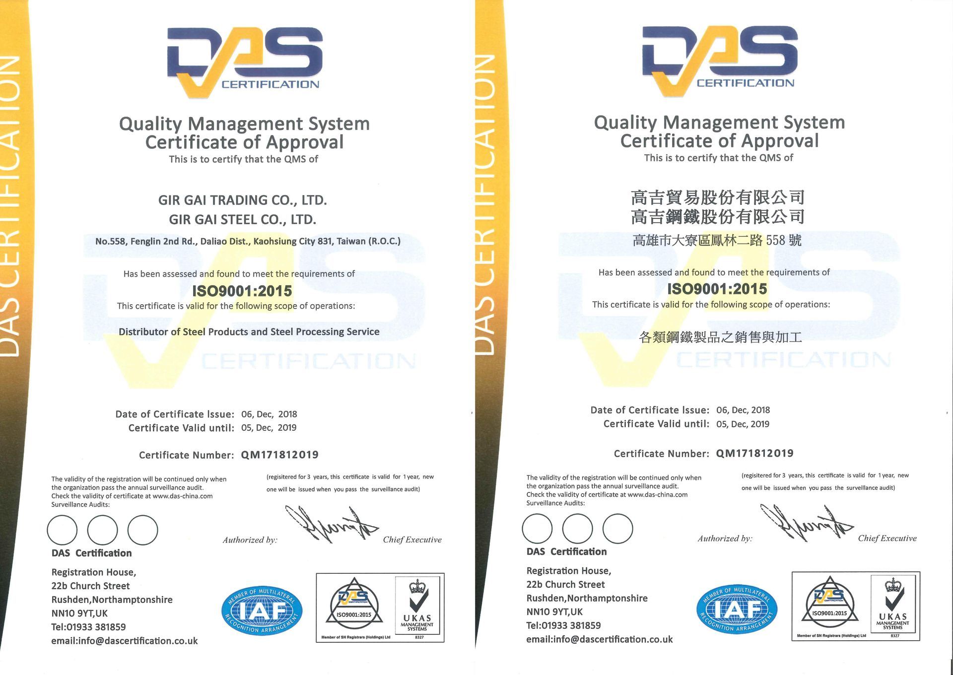 高吉深耕台灣,近年來業務擴展全球市場,像是東南亞、北美、非洲、南亞以及澳大拉西亞,服務內容包含三角貿易、進出口貿易和全球化銷售。為提升內外銷競爭力以及整體服務品質,民國104年取得UKAS ISO 9001品質管理系統認證,未來將提供更多鋼材產品多元化,專業加工精緻化,結合國際ESG時代來臨,成為永續企業的最佳典範。